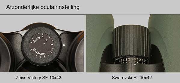 Bij de EL is dat één klikje en bij de SF moet dat op het gevoel een stukje. Terwijl bij de Victory 10x42 T*FL de oculairringen wel op tussenstanden inklikken, heeft men daarvan bij de SF afgezien. Jammer, want vooral bij gebruik van het oculairkapje verdraait de instelling vaak ongewild.