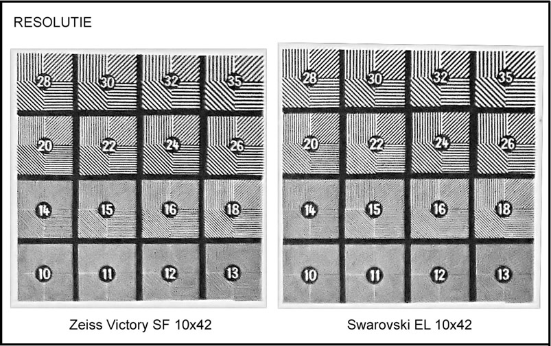 De beeldscherpte is van alle kijkers erg goed. De beide 10x kijkers scoren op mijn testkaart een resolutie van 2.8 boogseconden.