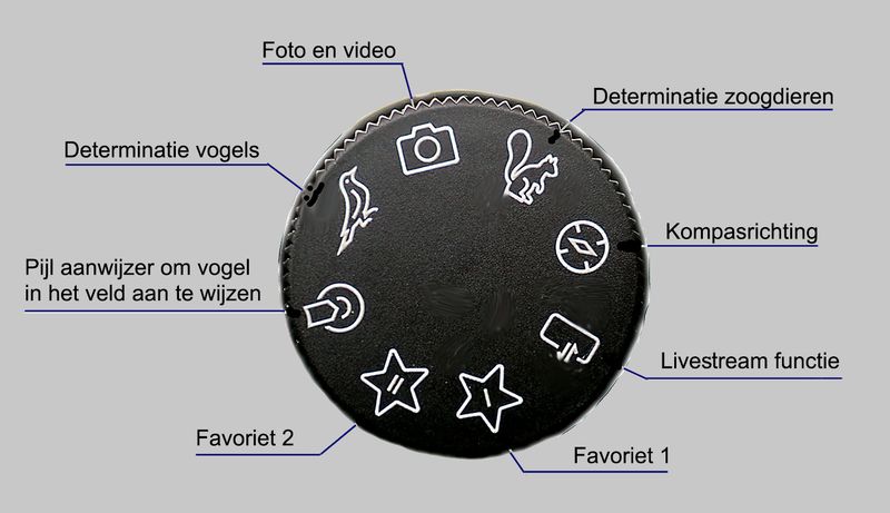 Op het keuzewiel staat een afbeelding van een vogel voor het determineren van vogels, en een eekhoorn voor het determineren van zoogdieren.