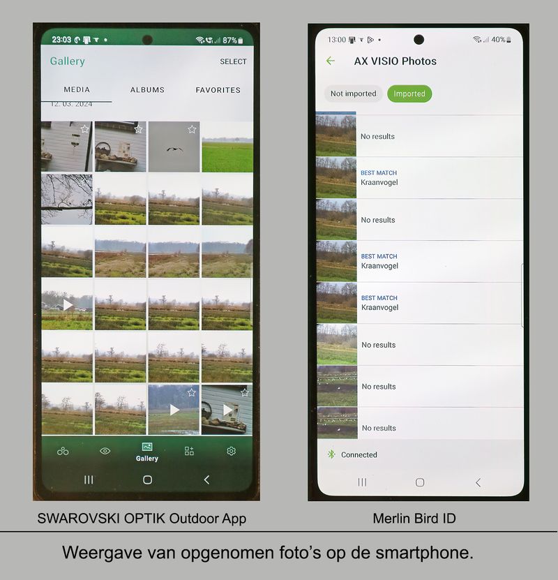 In het geheugen van de kijker zijn gemiddeld 7000 foto’s en ongeveer een uur film op te slaan. Met de applicaties Merlin ID en SWAROVSKI OPTIK Outdoor zijn de foto’s en video’s over te brengen naar de smartphone. Op mijn telefoon werden ze als volgt zichtbaar.