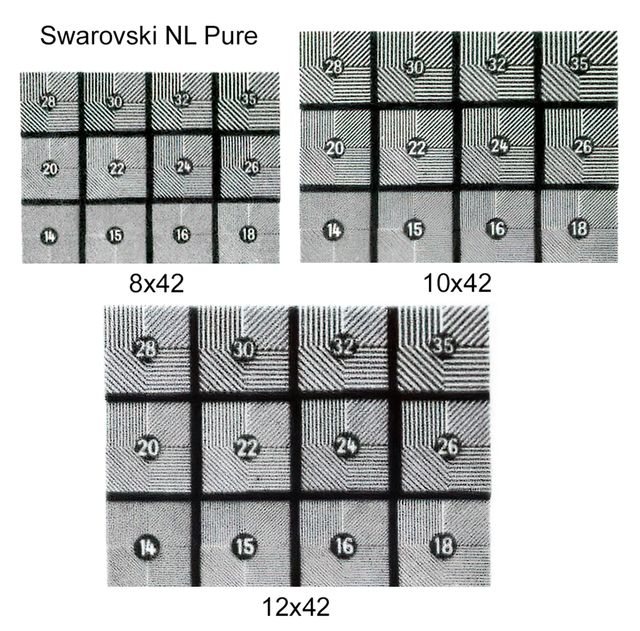 De beeldscherpte van de NL Pure in het centrum is bijzonder goed. Fotografisch gemeten haalt de 10x42 een centrumscherpte van 2.66 boogseconden. Wie die scherpte volledig wil benutten zou een gezichtsscherpte moeten hebben van ca. 26 boogseconden en dat haalt de gemiddelde gebruiker niet. Ook aan de randen van het grote beeld is de scherpte erg goed. Voor de beste randscherpte moet men de scherpstelknop dan wel iets bijstellen. Wat de dieptescherpte (of scherptediepte) betreft zie ik geen verschil met die van mijn referentiekijkers. Bij de 12x is die naar verwachting duidelijk geringer dan bij de 10x. En bij de 8x natuurlijk het grootst.